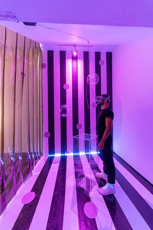LAS NOVELAS DEL ELSGÜER is a collaborative project between Colombian and Canadian artists, Laura Acosta and Santiago Tavera. Episodio 3 - Despecho en Vivo, is a Virtual Reality (VR) immersive and interactive installation piece. In this work, Laura’s fibre based characters infiltrate Santiago’s digitally animated fields, offering spaces of constant translation between physical and virtual experiences of the body. The notion of dislocation is the central theme of this project, as it questions the way bodies (more specifically migrant bodies) transgress borders and present themselves as multiple, within the realm of the virtual. Combining performative elements with digital environments within this virtual piece, further simulates a sense of dislocation for the viewers themselves. The general public is given access to this work through different mediums, allowing them to navigate spaces both physically and virtually. Immersed in an array of lights, sounds, colours, erratic physical movement, and digital animations, viewers find themselves inside a surreal fable of translucent bodies floating in the vastness of a borderless virtual suburban galaxy. LAS NOVELAS DEL ELSGÜER presents a suspended state of mixed realities in which digital environments merge with physical experiences, triggering virtual narratives of displacement.