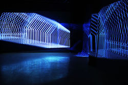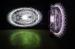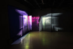 Stereo Linear Balance is a double channel video installation that stages an immersive and analog stereoscopic illusion. Plexiglass structures invade the gallery walls. They become reflective screens, activated through the light of the projected image. The repetition of lines and colours of the animations are projected onto the space and are reflected off of the plexiglass structures. The screens expand, duplicate and merge the images within the gallery space. The presentation of ephemeral and physical materials blurs the line between 2D and 3D. The animations from this work emerge from temporal studies on shadows and light motion in space. Furthermore, there is a 3D monitor looping stereographic animations, which were made using 3D drawing software, Sandde and are viewed using 3D filter polarized glasses (like the ones used at the cinema).